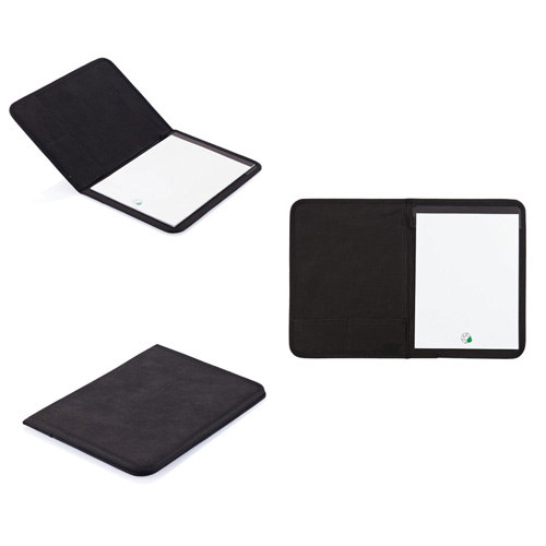 Portfolio with 2 card holders, one elastic pen loop, recycle mark and A4 20 sheet recycle notebook with white cover and recycle logo..
