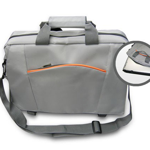 Light Grey Laptop Bag. WIth adjustable shoulder strap. Front zippered pocket for small items